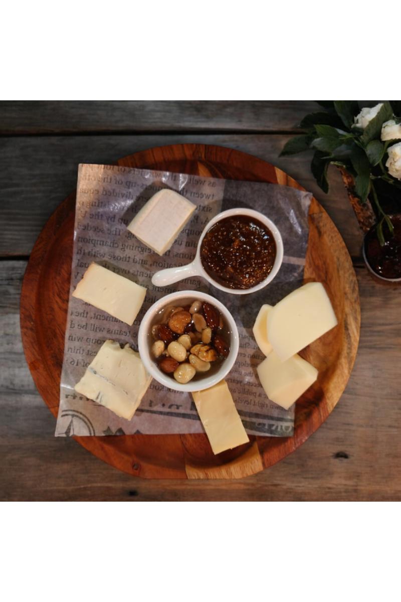 Osteplatte med 5 sorter ost servert med honningnøtter og fikenmarmelade