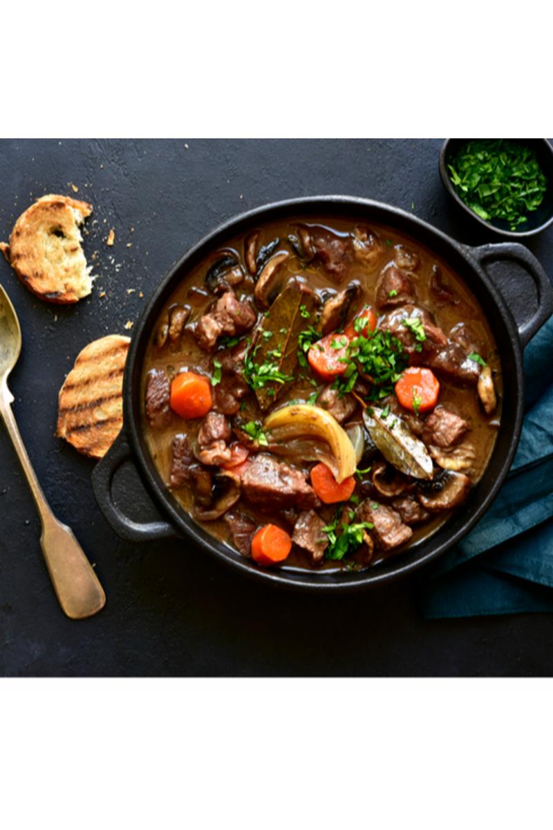 Oksegryte bestående av oksekjøtt, gulrot, sopp, løk, paprika og tomatisert saus.
