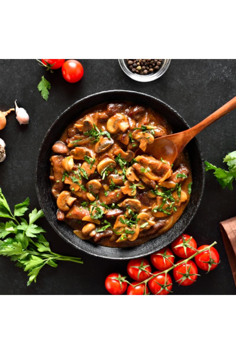 Klassisk Biff Stroganoff laget på oksekjøtt, sopp og løk servert i en tomatisert fløtesaus.
