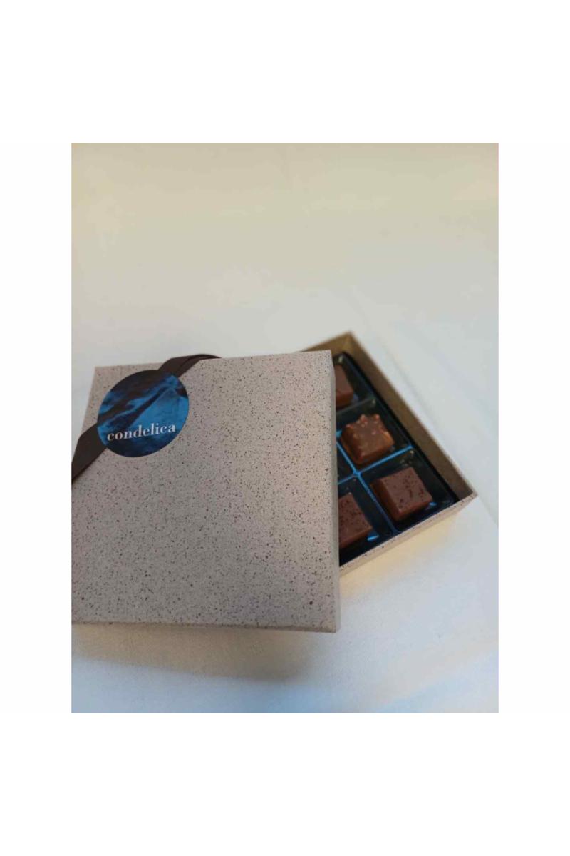 Denne esken inneholder 9 utvalgte biter, kun nøttepraliner, pakket i en eksklusiv eske.