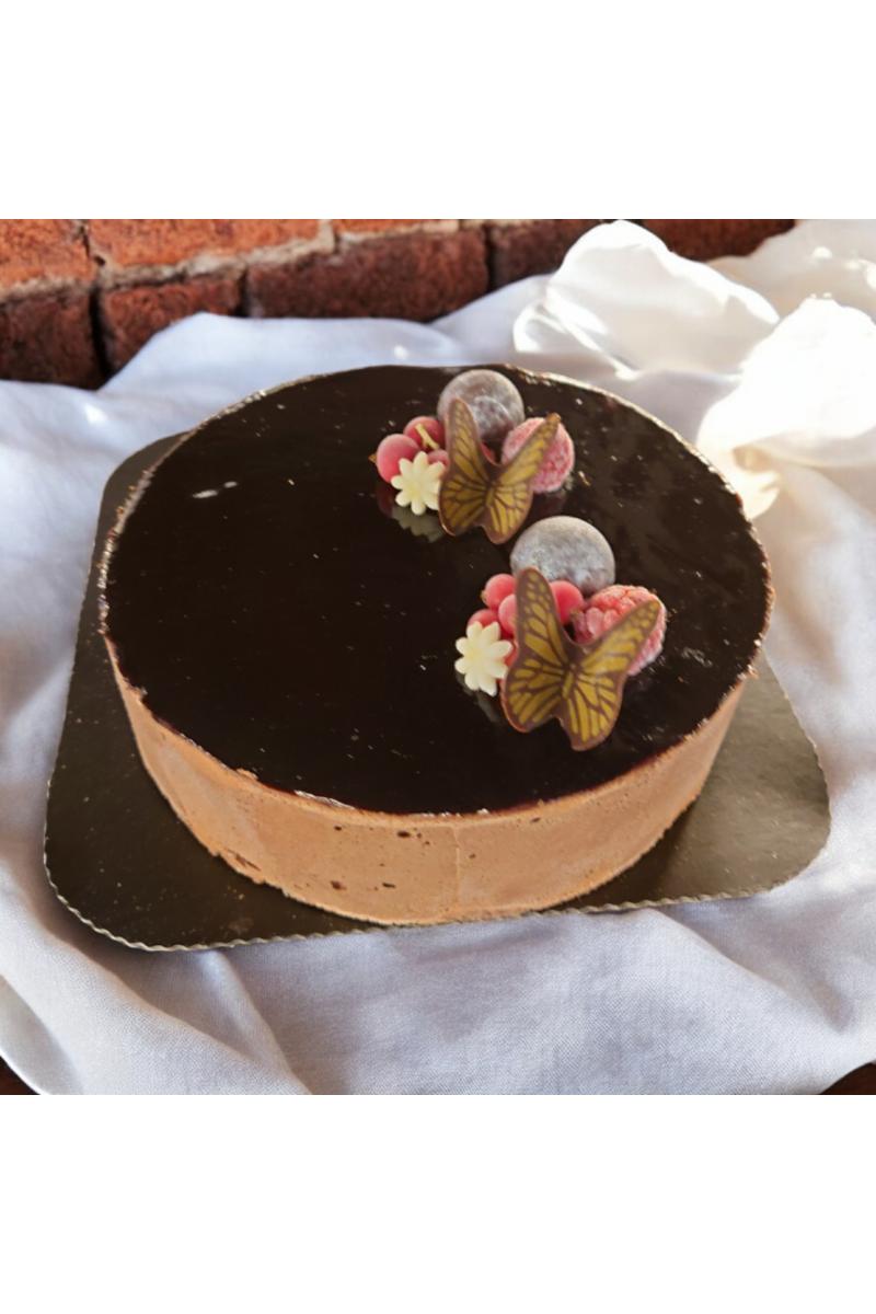 Elegant, mørk sjokolademousse på Grand Cru Vahlronasjokolade. Vaniljepannacotta og sjokoladebunner.