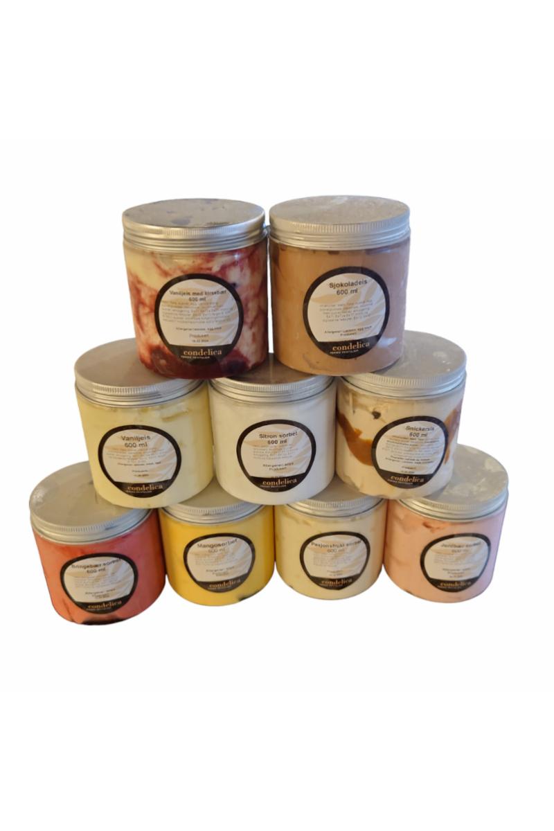 Her finnes et utvalg av 10 sorter med en blanding av is og sorbe.