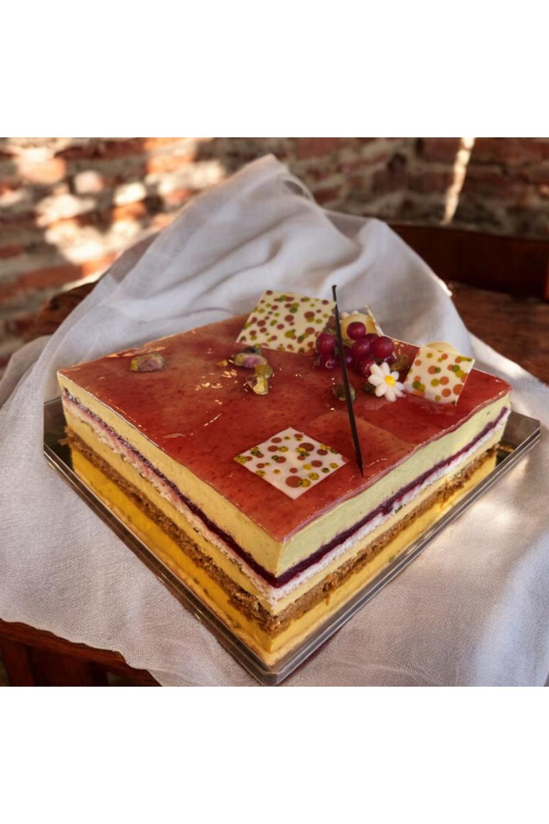 Pistasjemousse med kirsebærkompott på sprø pistasjebunn